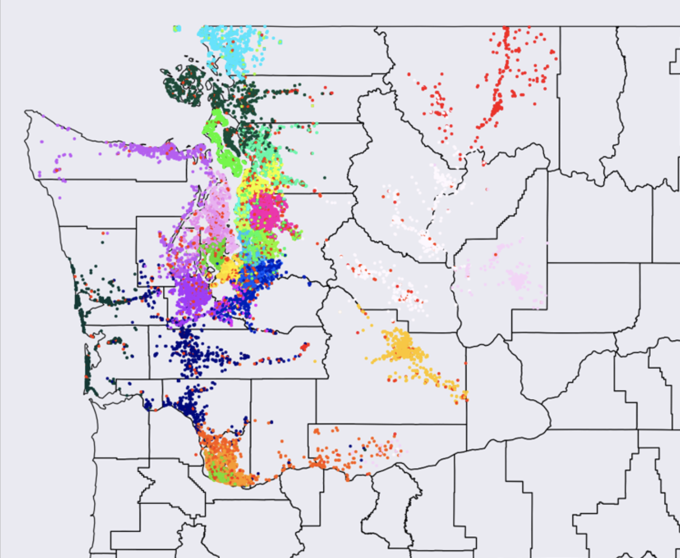 As you can see from the clustering of similarly colored points, homes assigned to the same BMU (i.e. assigned to the same cluster) are mostly collocated in the same geographical area. This clearly demonstrates that the learnt latent home factors representation is in large part driven by user home co-clicks in relatively small geographical areas (e.g. customers looking for their new home in particular city, along coast or major highways). Note that the map only shows homes in zip codes prefixed with ‘98’, which were part of our evaluation data set. Based on these insights that we were able to visually gather based on the SOM projection, we are now able to better interpret the type of information that our matrix factorization model is using to locate similar homes.