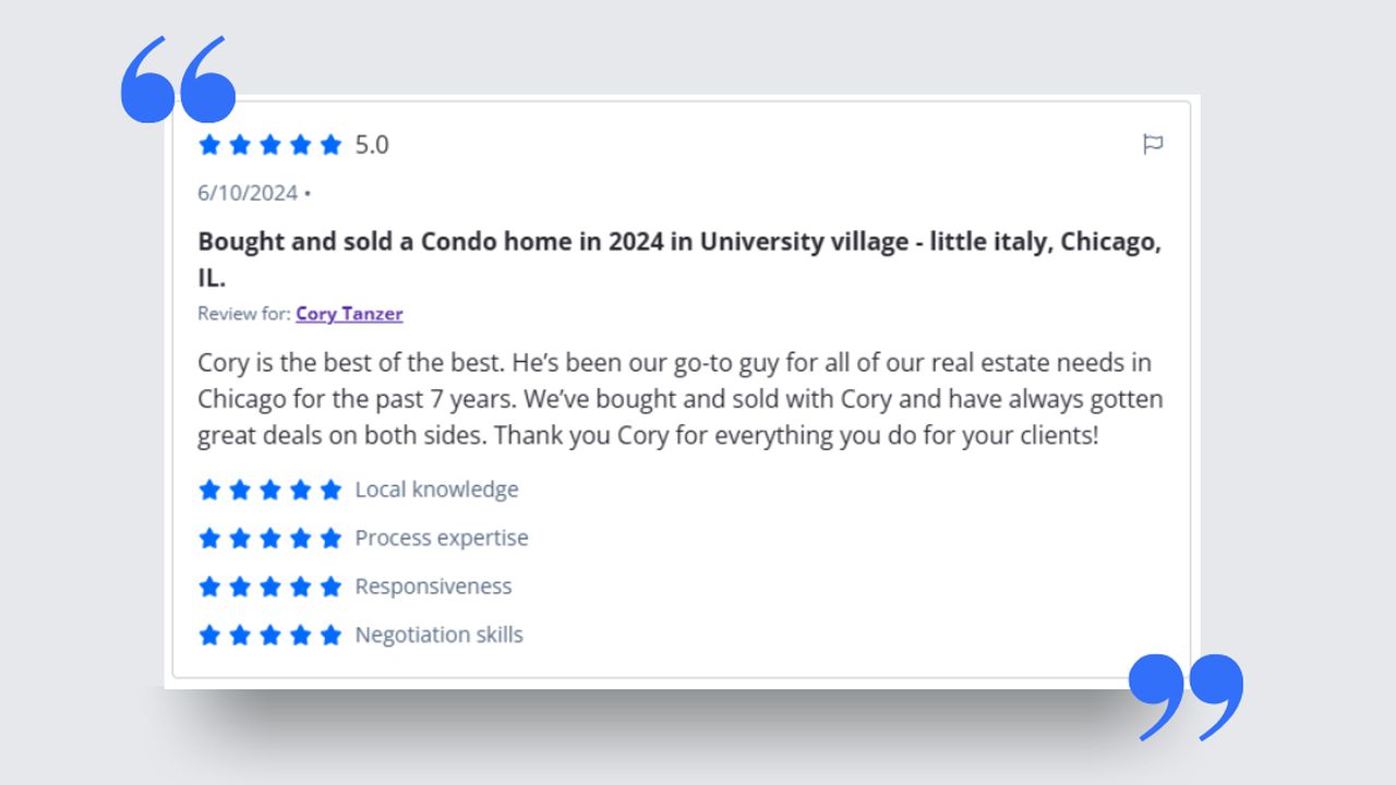 Cory Tanzer embodies integrity, energy, and dedication in every aspect of your real estate journey. A lifelong Chicagoan, Cory’s love for the city and its surrounding areas shines through from your first conversation to the closing table.
