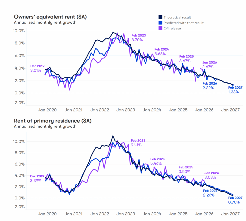 Monthly outlook: Owner’s Equivalent Rent, which measures what homeowners would theoretically pay to rent their own homes, is projected to have increased 0.18% in February 2026 (95% confidence interval: 0.13% – 0.38%) continuing the trend of gradual slowing into the new year. This would bring the annual increase in the index to 3.14%, a slight moderation from 3.26% in January. We expect the monthly growth to continue trending downward to a 0.13% pace over the year.